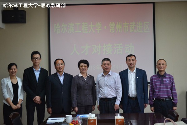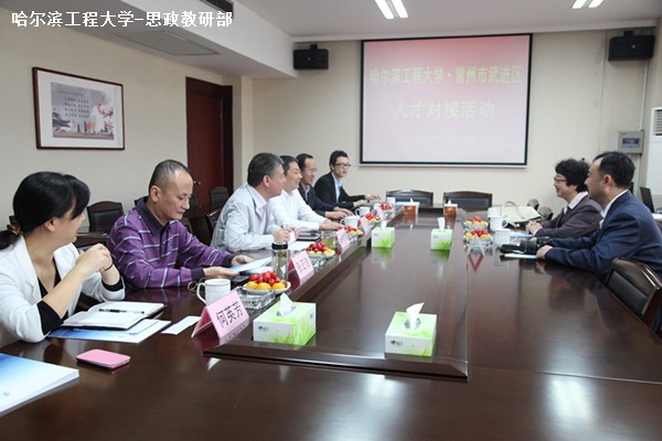 10月24日,在江苏省武进现代农业产业园区党委副书记杨威(挂职)协调和安排下,哈尔滨工程大学思政教研部与常州武进区人事与社会保障局举行了人才供求方对接见面会谈。区人民政府副区长王朝晖、区人社局党委书记顾中琪、区委组织部人才科蒋霄宇科长、区就业服务中心主任张正浩、区就业服务中心副主任何英芳出席会议。会议首先由顾中琪书记作人才推介,然后是陈坤主任介绍学校及我部毕业生情况,会议第三项是双方对接洽谈,最后由王朝晖副区长作总结发言。