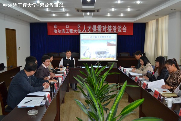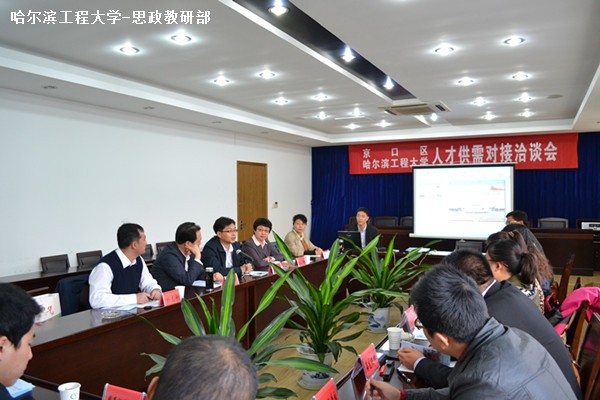 10月26日,在江苏省镇江市京口区人民政府副区长张爱国(挂职)协调和安排下,哈尔滨工程大学思政教研部与京口区人保局及13家知名企业举行了人才供求方对接见面会谈。会议由京口区人保局局长、党委书记刘平主持,首先由张爱国副区长介绍我校及毕业生的基本情况,然后是陈坤主任介绍思政教研部及我部毕业生情况,会议第三项是各个企业介绍并提供人才需求意向,刘平局长作总结发言。