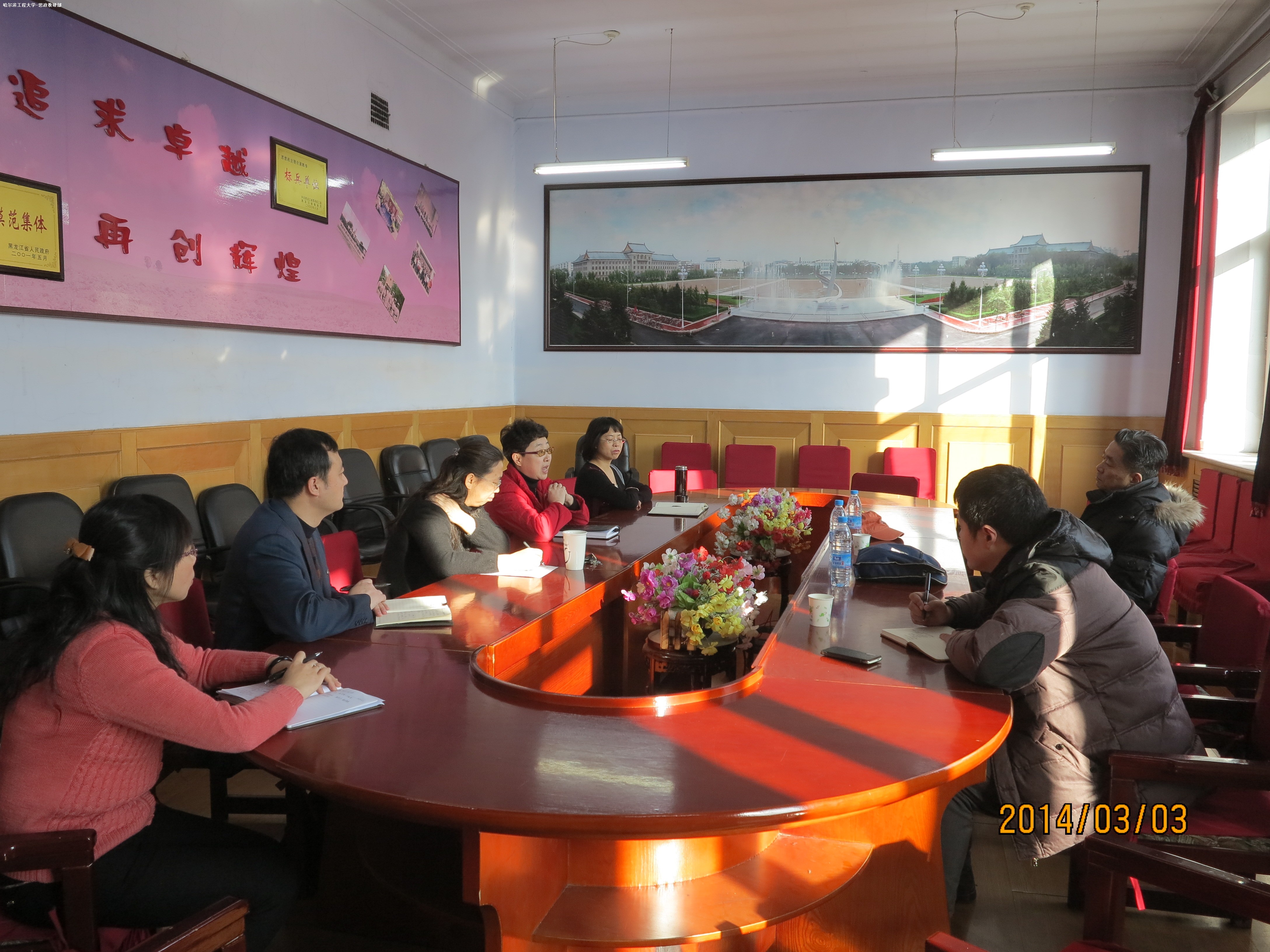 思政部主任兼党总支书记陈坤主持会议。陈红副主任汇报了近三年思想政治理论课建设情况。一是积极推进实践教学。经过近三年的建设,初步形成了,“学生为主体,教师为主导”的制度化、规范化、品牌化的“三化”实践教学模式,实践育人初见成效。在制度化建设上,制定完成了《哈尔滨工程大学实践教学实施方案》。2013年成功举办了首届博士生思想政治理论课论坛。围绕“科技进步与社会发展”这一主题,形成了《哈尔滨工程大学思想政治理论课博士生论坛论文集》。2014年5月将举办第二届博士生思想政治理论课论坛。《马克思主义基本原理》课程于2012年开始探索情景剧实践教学形式。2013年《思想道德修养与法律基础》课程首次开始采用法律专刊设计这一新的实践教学形式,取得较好的效果。二是不断深化教学内容,实现专题教学。2013-2014年秋季学期,《马克思主义基本原理》课程实施了专题教学。三是积极探索教学方法改革。近年来,思政教研部在沿用传统讲授方法的同时,又探索了新的教学方法――情境教学法。《思想道德修养与法律基础》课程借鉴心理学中的“团体心理辅导技术”创设教学情境。《马克思主义基本原理概论》课程采用“微电影”方式创设教学情境,形成了“案例导入,学生参与;教师讲授,网络支持”的教学模式。四是开展思政课多媒体课件大赛,提升教师教学手段。