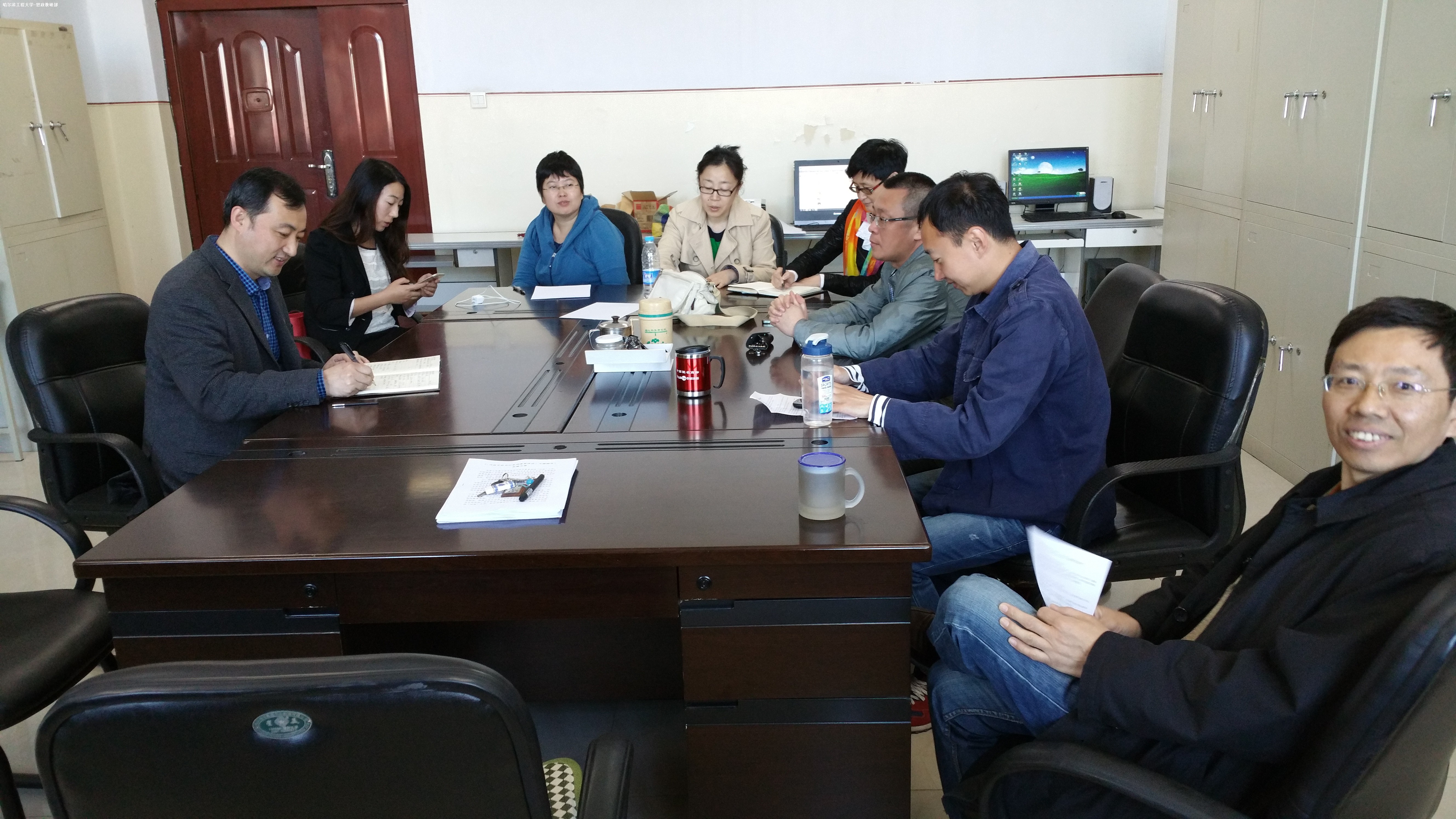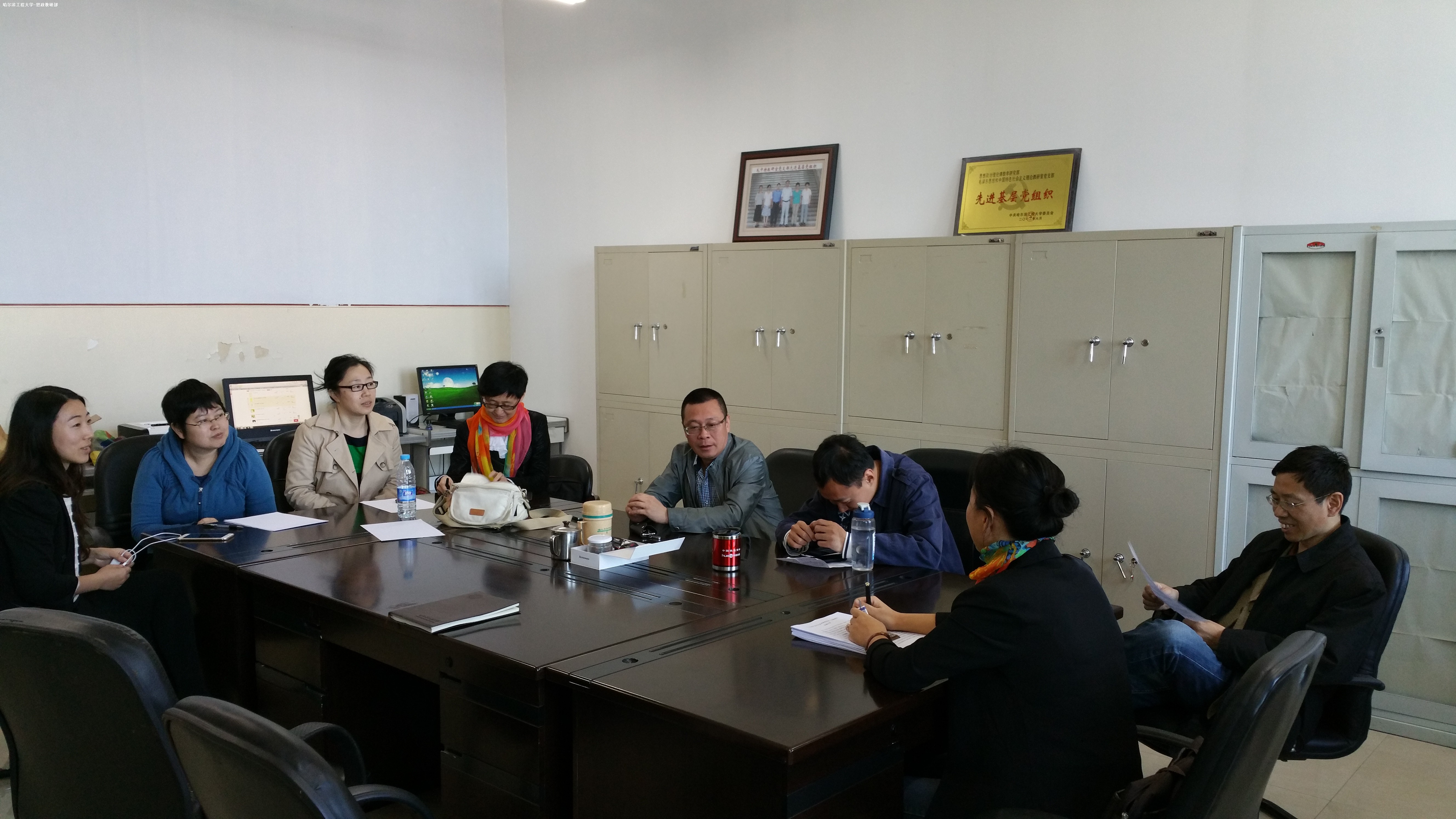 2015年5月20日上午10点,哈尔滨工程大学马克思主义学院马克思主义中国化和形势与政策联合党支部召开了一次独特的支部学习活动。活动由支部书记王国学主持,吴春莺、田朝晖、孟琦、闫金红、胡泊、王红、姜鹏参加了此次活动,院长助理杨志刚参与了讨论。