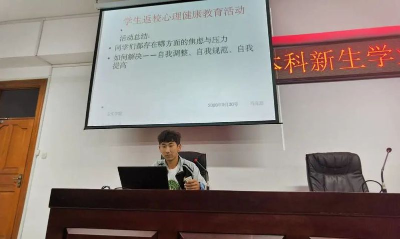 为使同学们尽快适应校园生活,缓解学生心理压力,疏导心理情绪,马克思主义学院于2020年9月30日,主楼420教室依据学生返校情况,及时了解学生返校后的心理需求,掌握学生心理状况,将解决心理问题与解决实际困难相结合,组织开展了具有针对性和特色性的心理健康教育品牌活动。2020级的巴合提努尔·达列力别克担任主讲人,2020级新生全体参加活动。