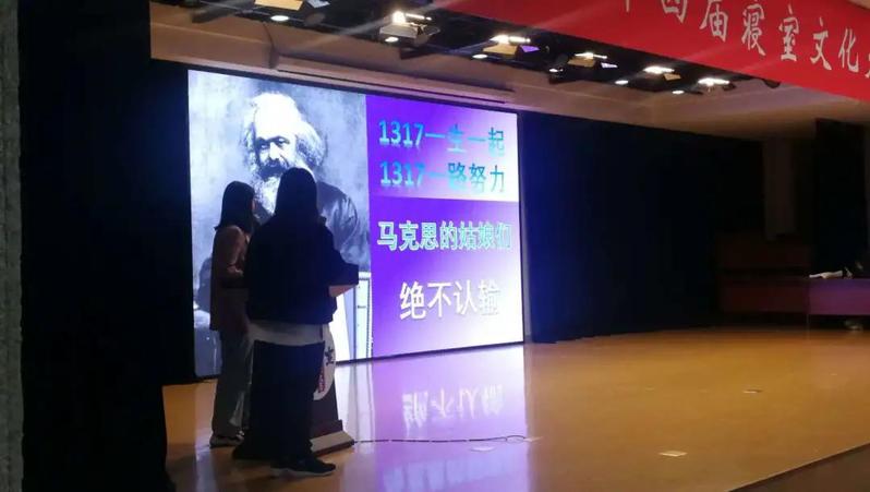 1316寝室参赛主题为“学术工程”,她们在展示寝室浓厚的学术氛围后,与其他参赛寝室分享了自己关于马列经典著作的读书心得,并演奏小提琴曲《瑞丽江边》。
