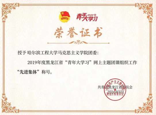哈尔滨工程大学马克思主义学院荣获2019年度黑龙江省“青年大学习”主题团课组织工作“先进集体”称号。